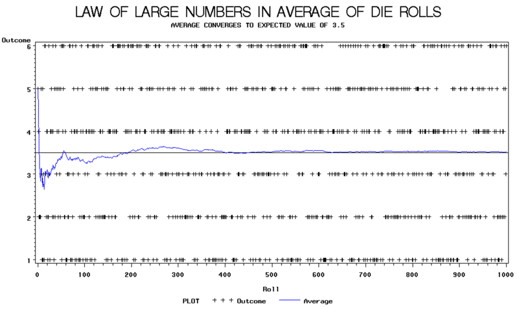Büyük sayılar yasası bir zarın peş peşe atılması ile örneklenebilir. Öyle ki, multinom dağılımı sonucunda 1, 2, 3, 4, 5 ve 6 sayılarının gelme olasılığı eşittir. Bu sonuçların nüfus ortalaması (ya da “beklenen değeri),