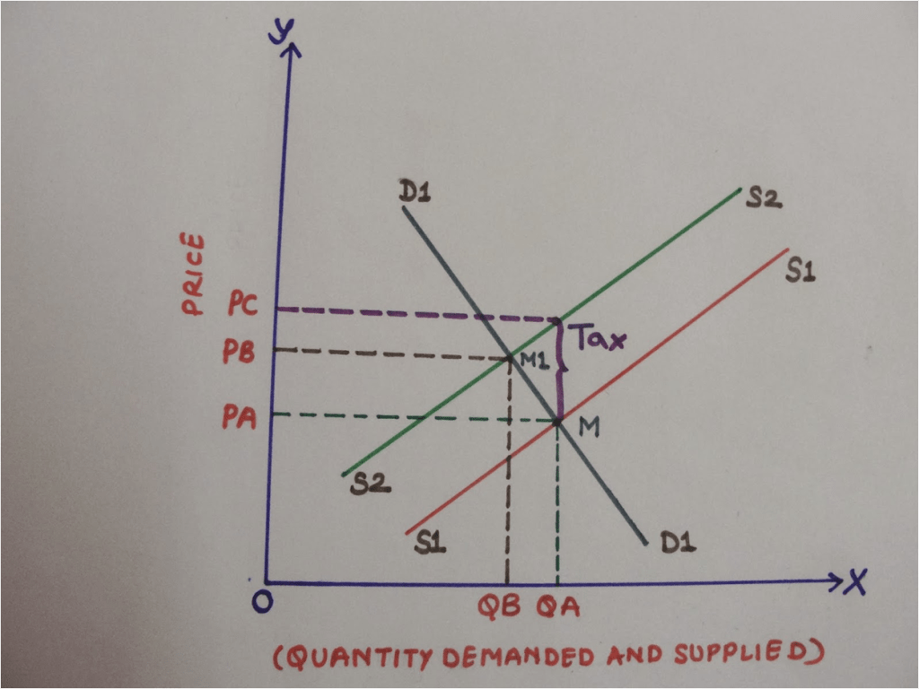 S1 ve S2 arz eğrileri arasındaki bölge vergidir. Artık denge miktarı QB ve PB denge fiyatıdır.Böylece fiyat PA’dan PB’ye doğru yukarı doğru hareket eder ve denge miktarı QA’dan QB’ye doğru içeri doğru hareket eder.Şimdi verginin fiyat ve miktarı nasıl etkilediğini görelim. Diyagram, vergi sonrası denge fiyatında bir artış ve denge miktarında bir düşüş olduğunu açıkça göstermektedir.