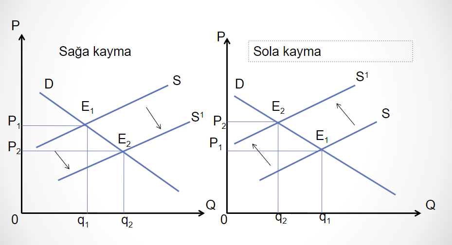 Şimdi de verginin uygulandığı durumu ele alalım. Arz eğrisi konumunu değiştirir ve sola doğru hareket ederek bize yeni arz eğrisi olarak S2’yi verir. Burada talep eğrisini değiştirmeyelim ve olduğu gibi tutalım. Arz kayması denge noktasını da kendisiyle birlikte M1’e götürür. Diğer bir deyişle arz kayması denge noktasının M’den M1’e değişmesine neden olur.