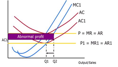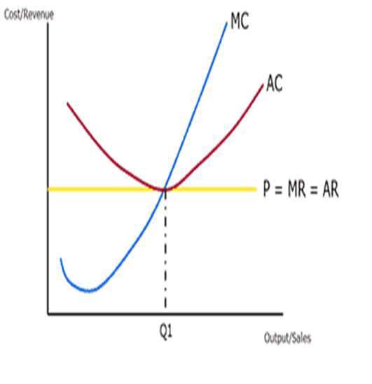 MC, ek (marjinal) çıktı birimleri üretmenin maliyetidir. İlk önce düşüyor (azalan verim yasası nedeniyle), sonra çıktı yükseldikçe yükseliyor. Ortalama maliyet eğrisi standart ‘U’ şeklindeki eğridir. MC, marjinal ve ortalama değerler arasındaki matematiksel ilişki nedeniyle AC eğrisini en düşük noktasında keser. Endüstri fiyatı, bir bütün olarak endüstrinin arz ve talebi tarafından belirlenir. Firma, endüstri içinde çok küçük bir tedarikçidir ve fiyat üzerinde kontrol sahibi değildir. Her ekstra birime aynı fiyata satış yapacaklar.