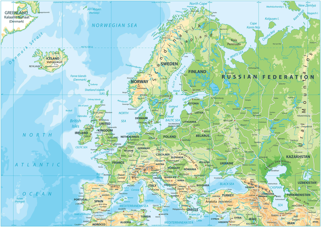 Fiziksel olarak, fakat kültürel olarak değil, Avrupa aslında üç tarafı denizlerle çevrili bir yarımada olan Asya’nın batı bir uzantısıdır. Doğu sınırı çok daha belirsizdir, çok etkileyici olmayan Ural Dağları, Hazar Denizi ve Akdeniz ile Karadeniz’i birbirine bağlayan dar su yolları ile işaretlenmiştir. Haritaya bir bakış, bu sınırın aslında iki önemli ülke – Rusya ve Türkiye tarafından sınırlandığını gösterecektir. Avrupa içinde, Alpler gibi bir dizi dağ silsilesi ile ayrılmış, kuzey ve güney olmak üzere iki büyük fiziksel / iklim bölümünü birbirinden ayırabiliriz.
