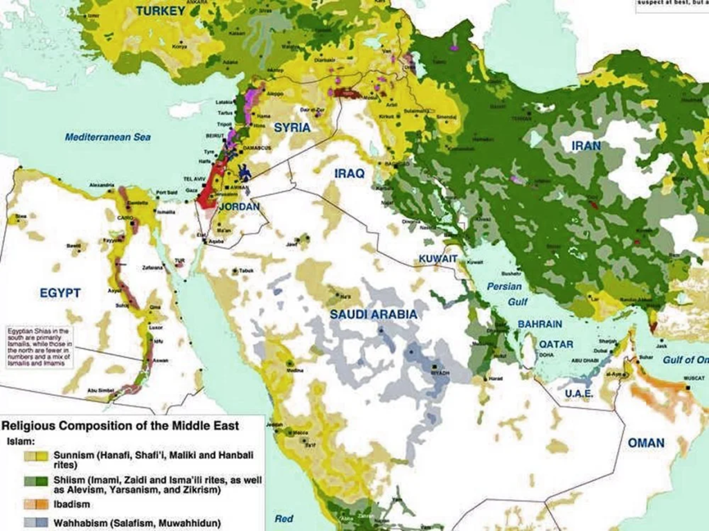 Orta Doğu, İsrail ve Lübnan dışında din ağırlıklı olarak Müslüman. Bununla birlikte, Müslüman dünyası, çoğu Arap ülkesinde İslam’ın Sünni şubesi baskınken, Şii taraftarları Irak ve İran’da daha fazla olmakla birlikte, Hıristiyan dini kadar mezhepsel hatlara bölünmüştür. Bölgenin çoğu ülkesinde önemli etnik ve dini azınlıklar bulunmaktadır (Irak klasik bir örnektir).