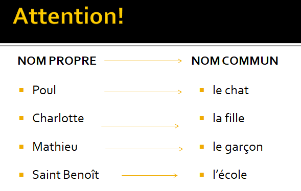 Si le nom n’est pas un nom propre, alors c’est un nom commun. La plupart du temps, on utilise des déterminants devant les noms communs.