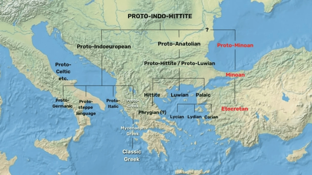 Anadolu hipotezine göre Anadolu ve Ege dilleri arasındaki yakınlık. Yunan dili Hint-Avrupa dil ailesinin bağımsız bir koludur. Kaynak: Greek Reporter