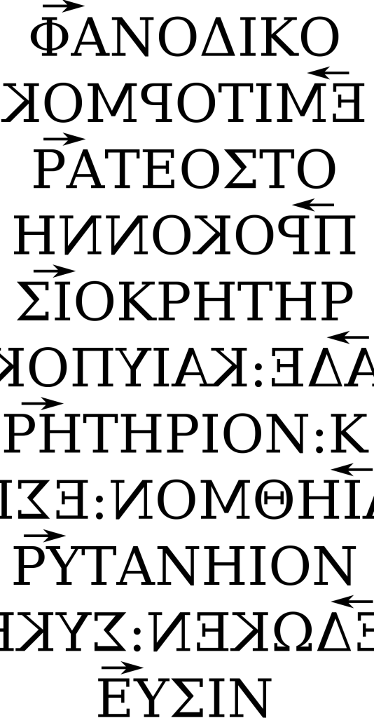 Arkaik dönemin başlarındaki Yunan yazısının, daha önceki uygarlıklarda da bulunan bir başka özelliği de “Boustrophedon” adı verilen yazı stilidir. Bu stilde, satırların her zaman aynı taraftan, yani soldan başladığı modern yazı stilimizin aksine, harfler de ters, ayna tarzında yazılır.