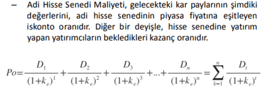 – Öz kaynak sermayesi maliyeti: İmtiyazlı hisse senetlerine şirket ana sözleşmesinde belirtilen sabit bir temettü oranı uygulanır. Bu hisse senetlerinin maliyeti bu temettü oranına göre belirlenir.