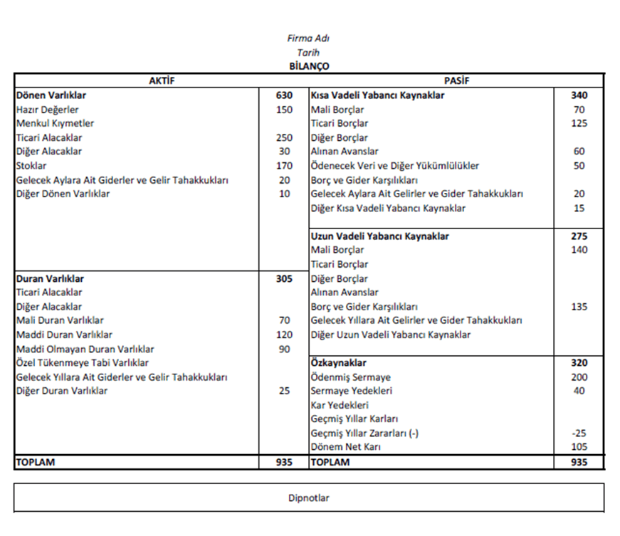Bilanço: Bilanço, işletmenin belli bir tarihteki varlıklarını ve bu varlıkların sağlandığı kaynaklarını gösteren mali bir tablodur. Bilanço muhasebe sisteminin en önemli tablolarından biridir. Bilanço işletmeler açısından son derece fayda sağlamaktadır. Bilançonun biçiminde dört bölüm bulunmaktadır.
