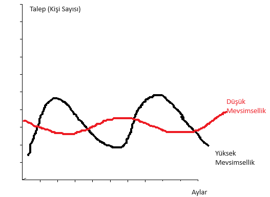 Soru: Bir destinasyondaki talebin mevsimsellik özelliğinin güçlü olduğu ve olmadığı duruma ait iki farklı durumu tek bir grafik üzerinde (iki farklı eğri ile) anlatınız.