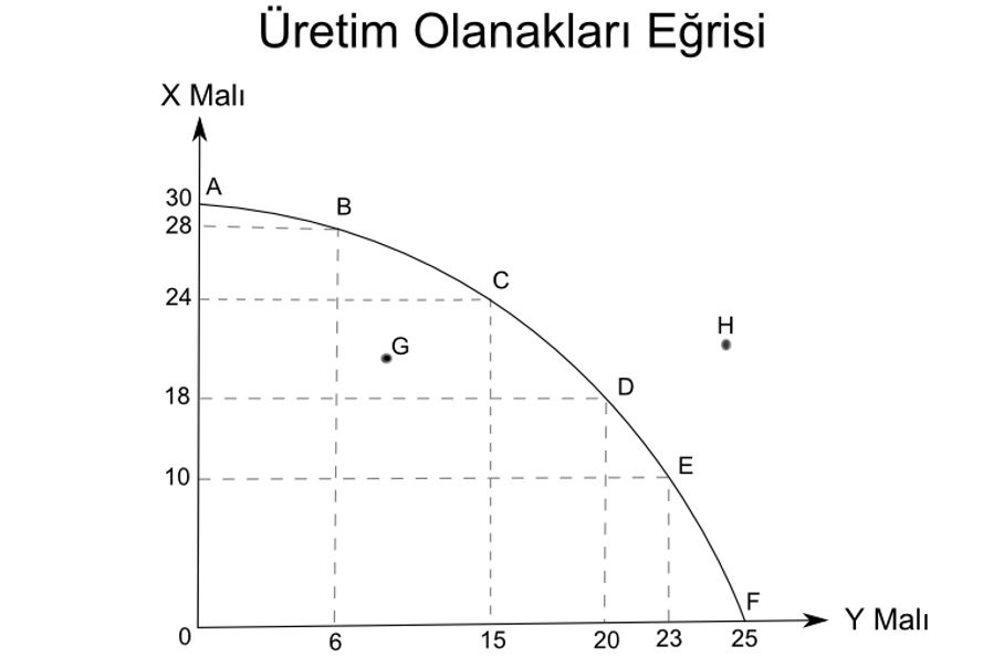 14. Aşağıdaki üretim olanakları eğrisindeki noktalardan hangisi gerçekleştirilebilir değildir?