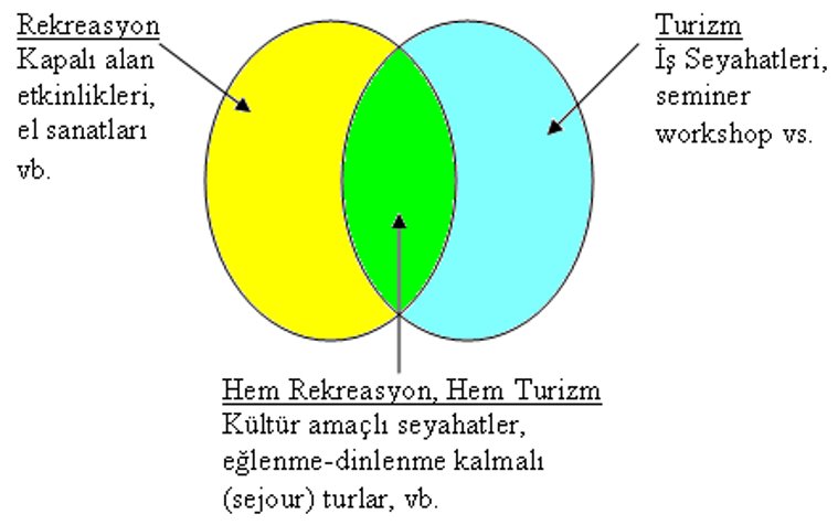 - Rekreasyon ve turizm birbiri ile iç içe geçmiş iki kavramdır. Rekreasyon, turizmi kapsayan bir kavram olmasına rağmen; her turizm etkinliği aynı zamanda rekreasyon etkinliği değildir. İş turizmini buna örnek olarak verebiliriz.