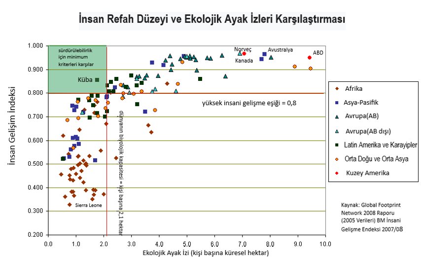2008 yılında kişi başına, 2,1 hektar olan doğal biyolojik kapasitesinden %30 daha fazla, kişi başına 2,7 hektara ihtiyaç duyulmaktadır.
